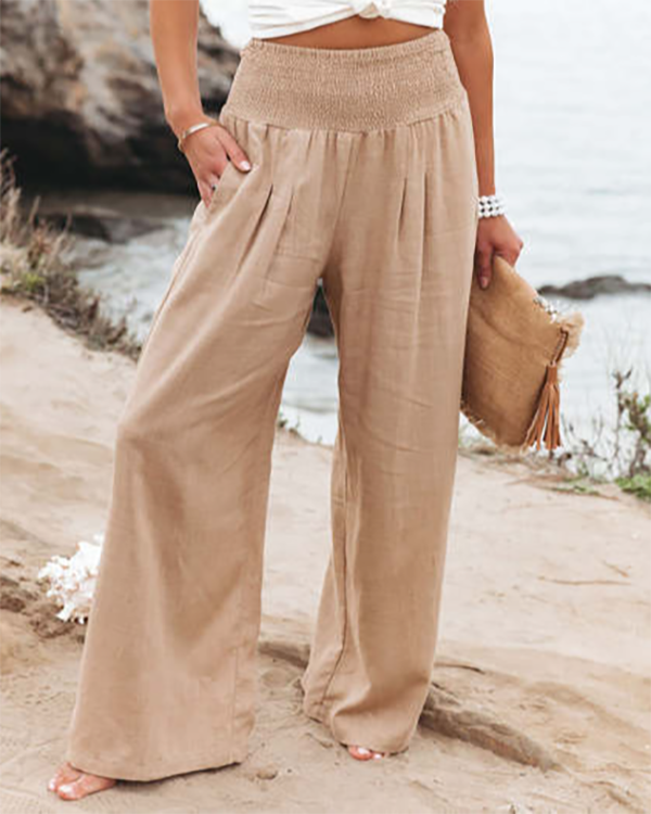 Casual Solid Pocket Elastic Waist Linen Pants
